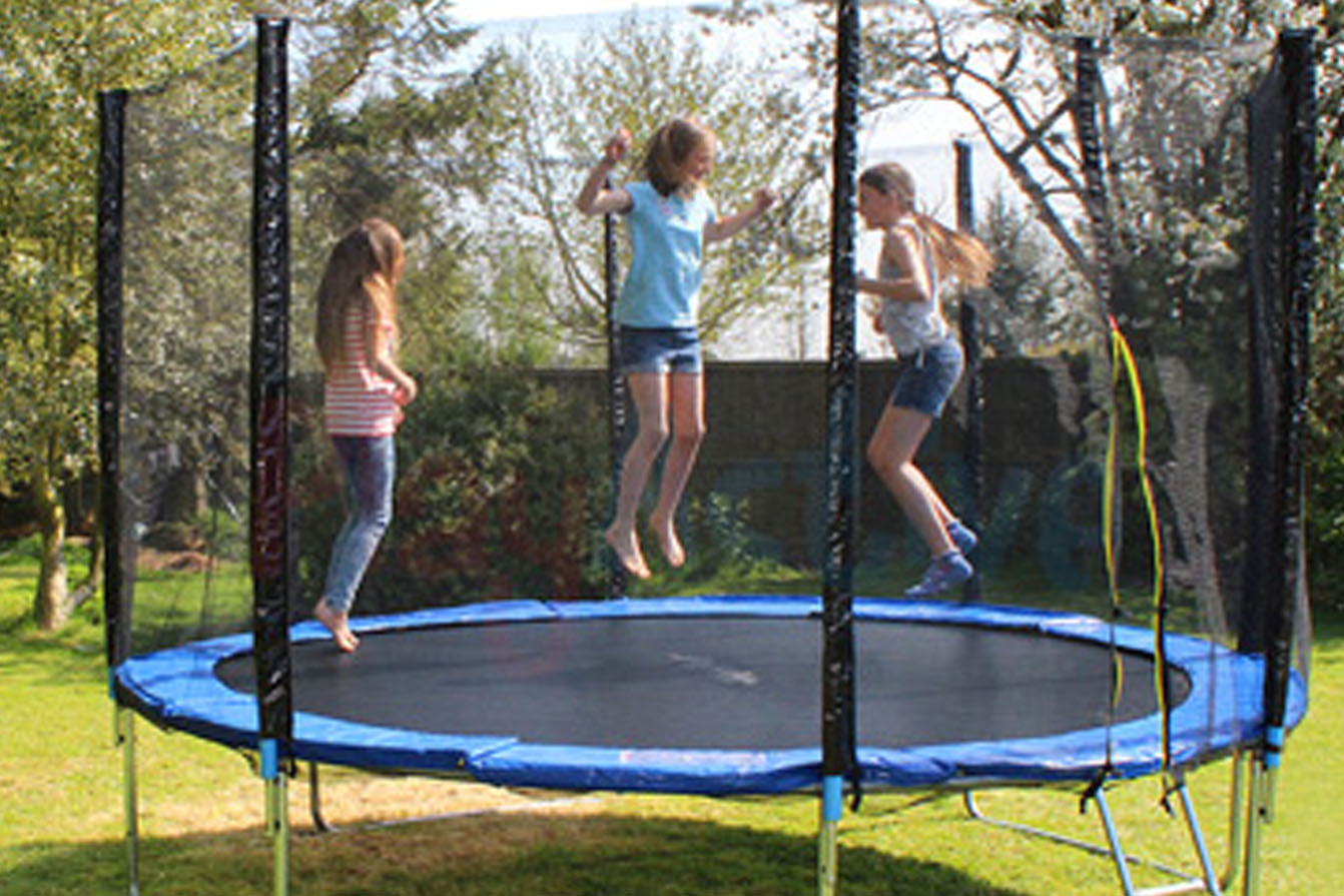 A trampoline is a device consisting of a piece of taut, strong fabric stretched between a steel frame using many coiled springs. People bounce on trampolines for recreational and competitive purposes. The fabric that users bounce on (commonly known as the "bounce mat" or "trampoline bed") is not elastic itself; the elasticity is provided by the springs that connect it to the frame, which store potential energy.
